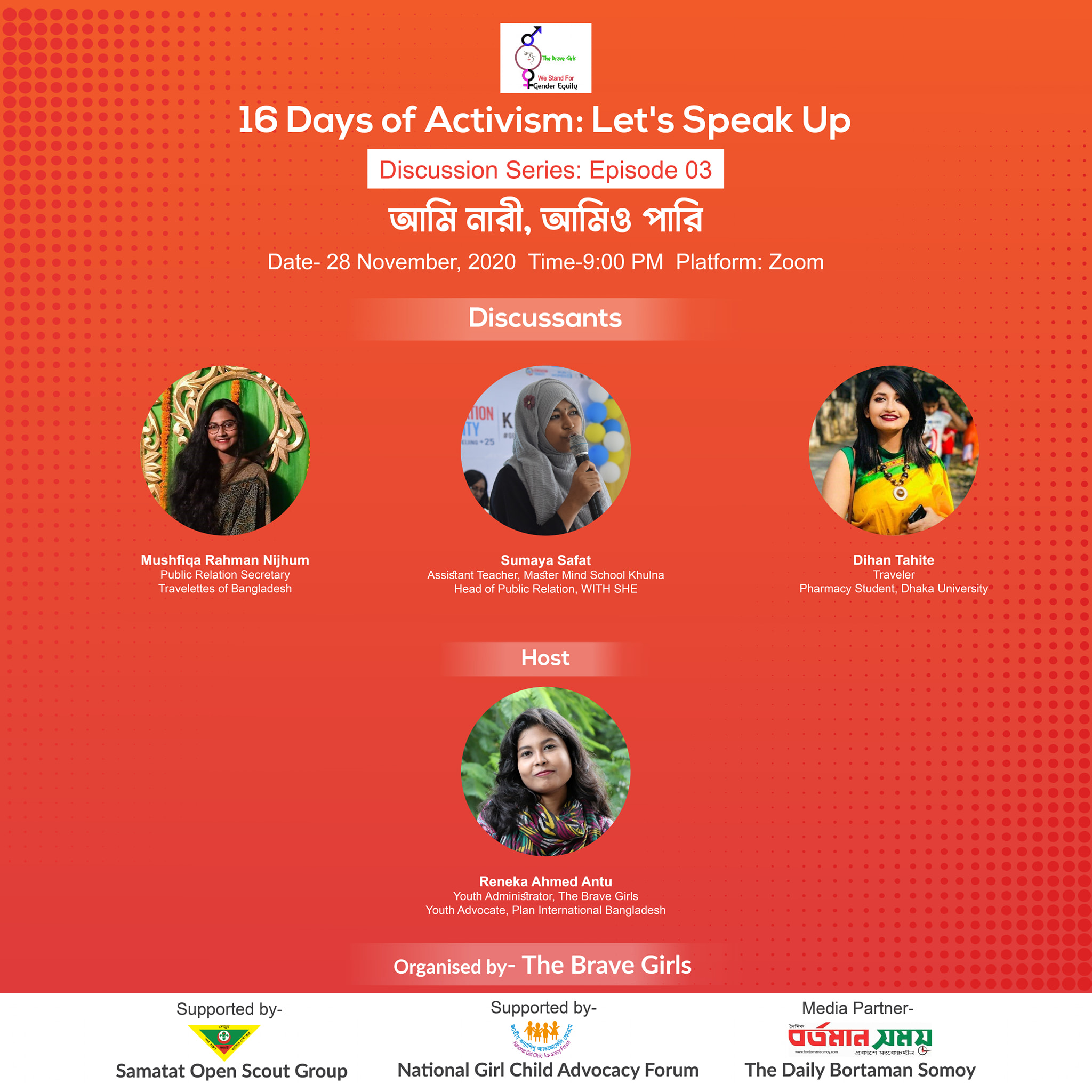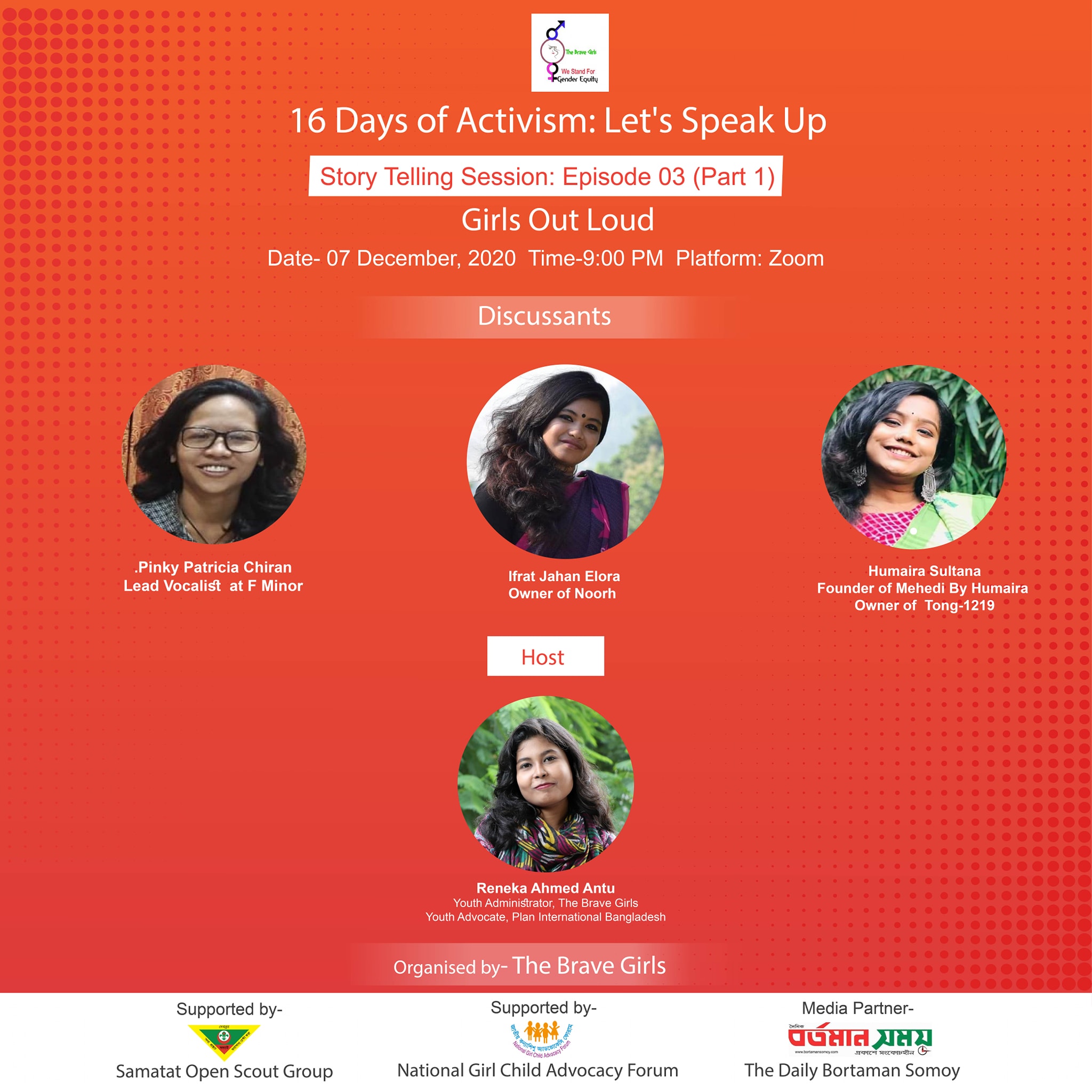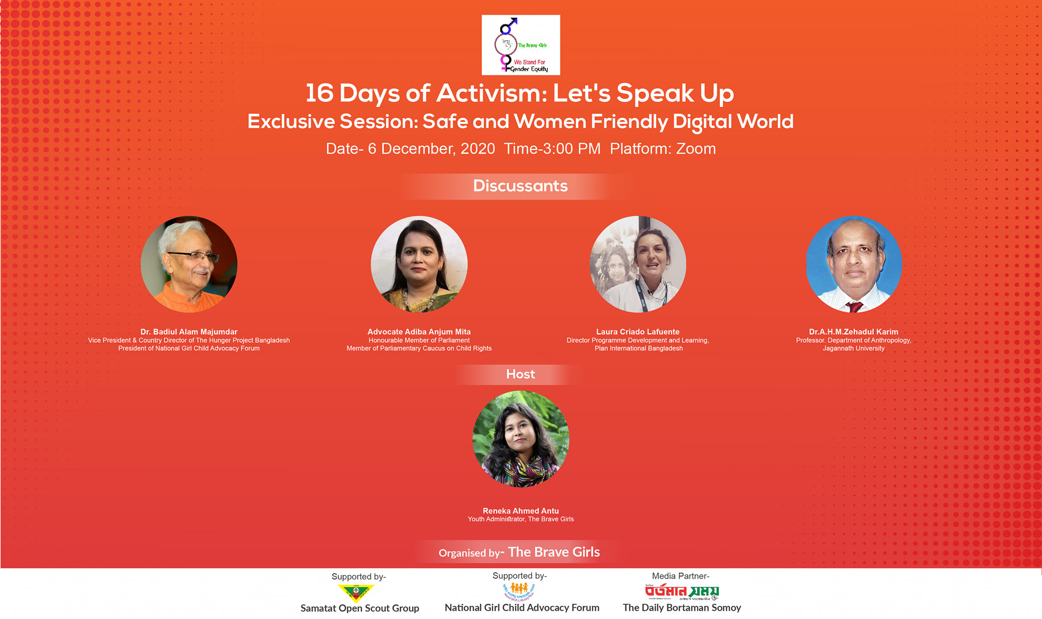 ‘দি ব্রেভ গার্লস’ গত ২৫ নভেম্বর থেকে জেন্ডার ভিত্তিক সহিংসতা রোধের জন্য সচেতনতা বৃদ্ধির উদ্দেশ্যে “সিক্সটিন ডেইস অ্যাক্টিভিজম: লেটস স্পিক আপ” অনলাইন ক্যাম্পিং করে আসছে। ক্যাম্পেইনের একটি কর্মসূচি বিশেষ আলোচনা সিরিজ। এছাড়াও ক্যাম্পিনং এর কর্মসূচিতে থাকছে; স্টোরি টেলিং সেশন, প্রবন্ধ প্রতিযোগিতা, বিষয়ভিত্তিক আলোচনা সিরিজ। বিশেষ আলোচনা সিরিজ এর একটি অংশ ছিল “এক্সক্লুসিভ সেশনঃ নিরাপদ ও …. Read More