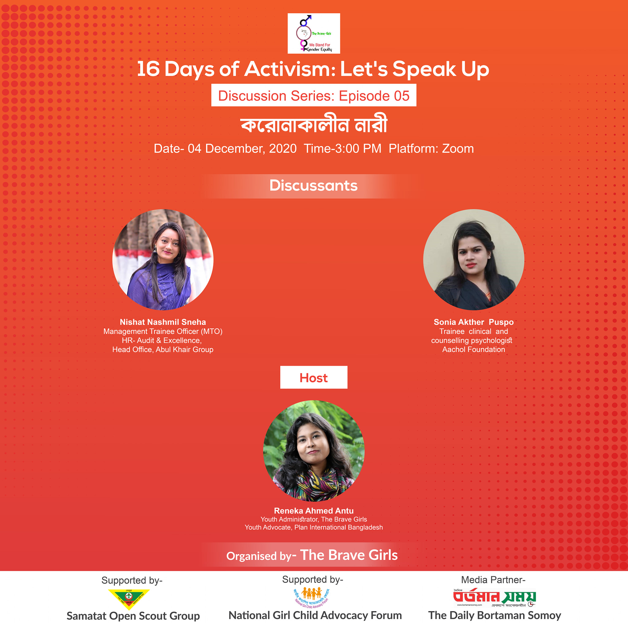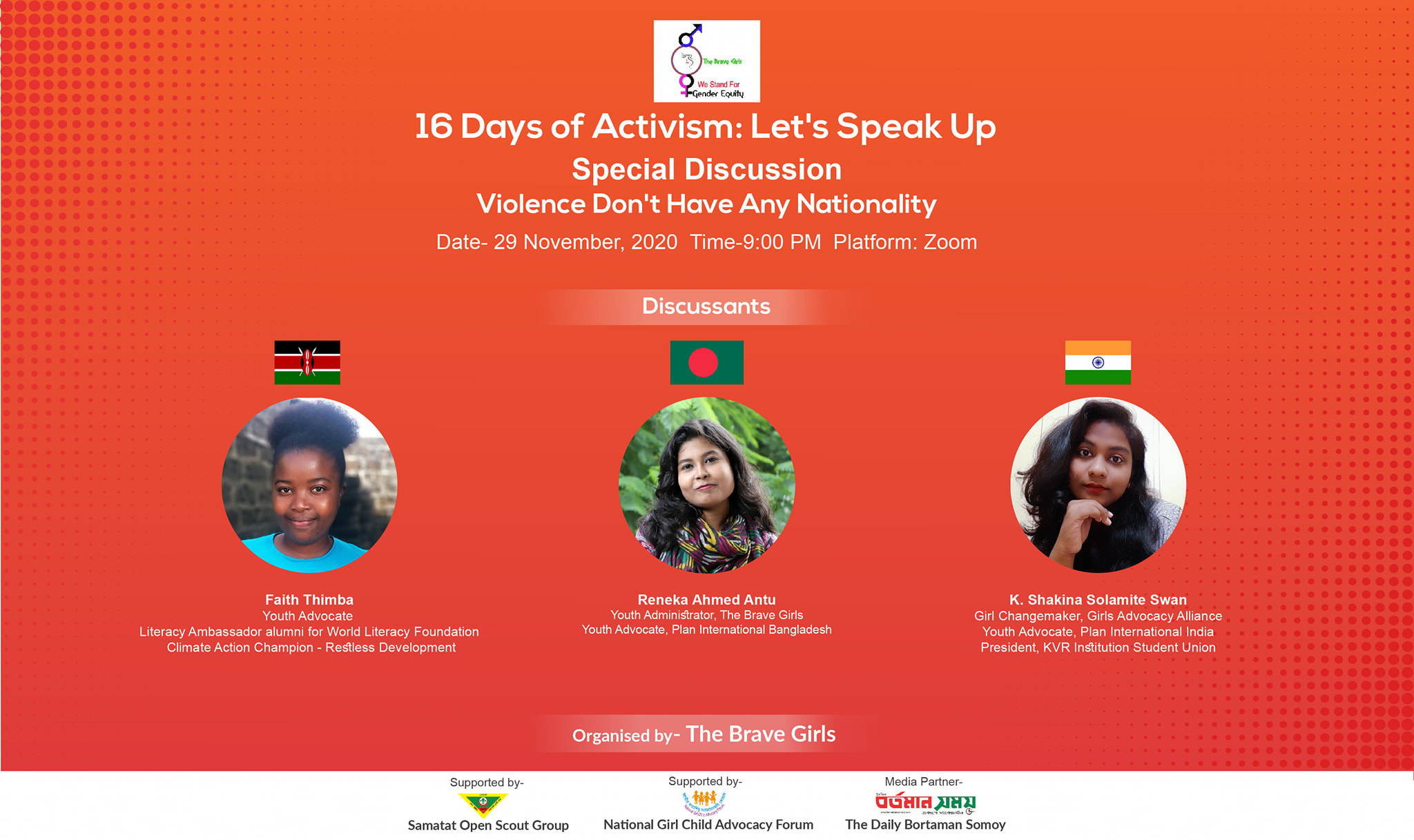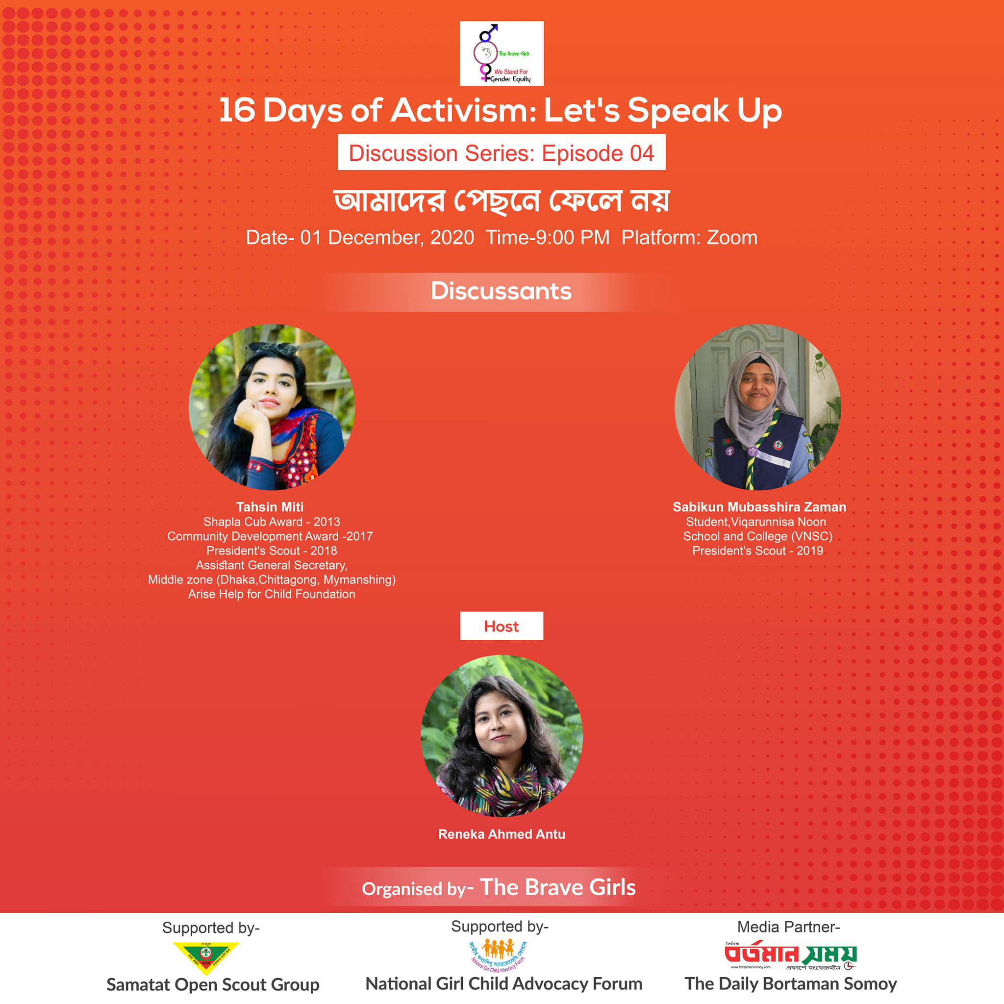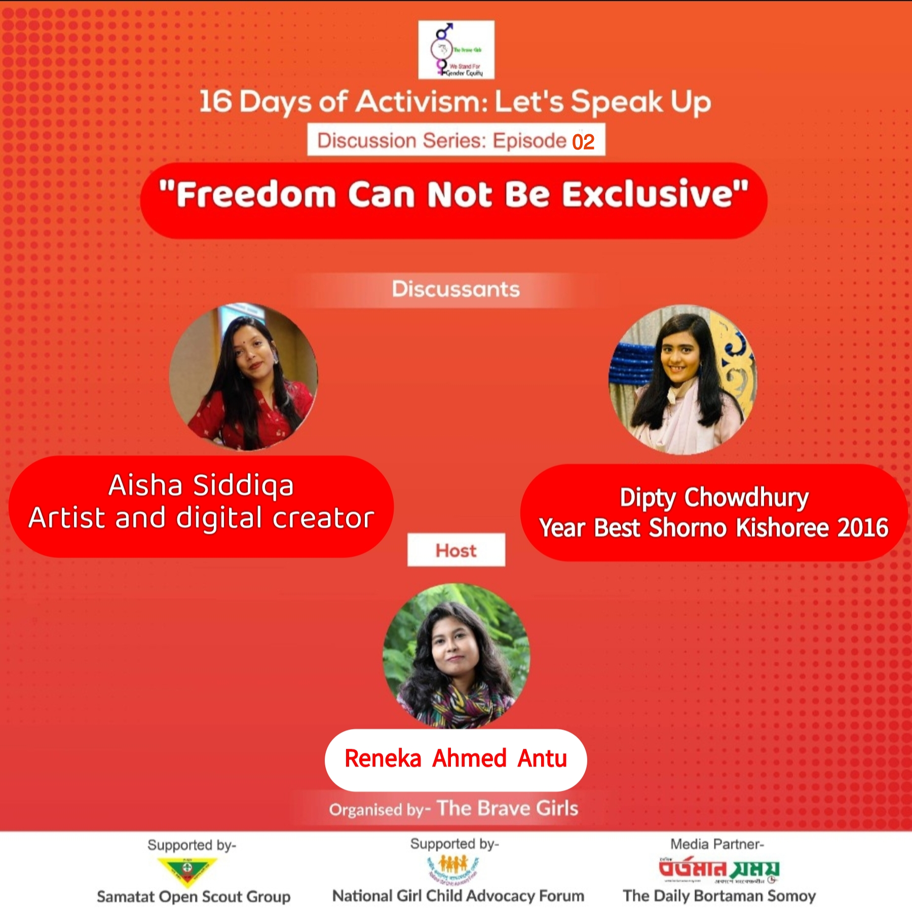‘দি ব্রেভ গার্লস’ গত ২৫ নভেম্বর থেকে জেন্ডার ভিত্তিক সহিংসতা রোধের জন্য সচেতনতা বৃদ্ধির উদ্দেশ্যে “সিক্সটিন ডেইস অ্যাক্টিভিজম: লেটস স্পিক আপ” অনলাইন ক্যাম্পিং করে আসছে। ক্যাম্পেইনের একটি কর্মসূচি বিশেষ আলোচনা সিরিজ। এছাড়াও ক্যাম্পিনং এর কর্মসূচিতে থাকছে; স্টোরি টেলিং সেশন, প্রবন্ধ প্রতিযোগিতা, বিষয়ভিত্তিক আলোচনা সিরিজ। বিশেষ আলোচনা সিরিজ এর একটি অংশ ছিল “এক্সক্লুসিভ সেশনঃ নিরাপদ ও …. Read More