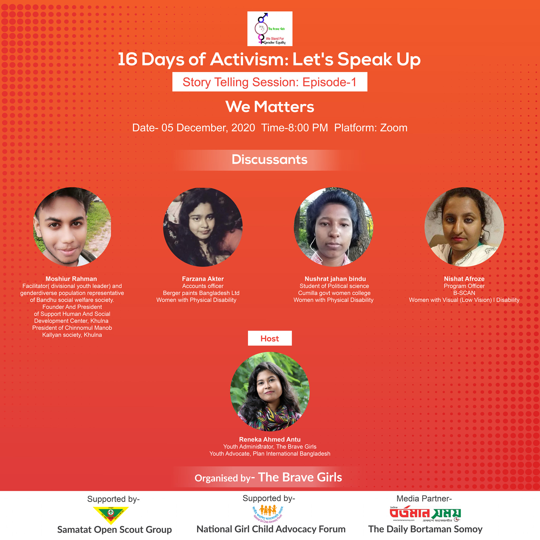 ‘দি ব্রেভ গার্লস’ গত ২৫ নভেম্বর থেকে জেন্ডার ভিত্তিক সহিংসতা রোধের উদ্দেশ্যে “সিক্সটিন ডেইস অ্যাক্টিভিজম: লেটস স্পিক আপ” ক্যাম্পিং করে আসছে। ক্যাম্পেইনের একটি কর্মসূচি স্টোরি টেলিং সেশন। এছাড়াও ক্যাম্পিনং এর কর্মসূচিতে থাকছে; বিষয়ভিত্তিক আলোচনা সিরিজ, প্রবন্ধ প্রতিযোগিতা, বিশেষ আলোচনা সিরিজ। স্টোরি টেলিং সেশনের প্রথম পর্বের বিষয়বস্তু ছিল উই ম্যাটারস। রবিবার (৬ ডিসেম্বর) রাত নয়টায় জুম …. Read More